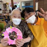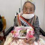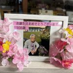 2月にめでたく105歳を迎えられて、皆様と一緒にお祝いをしました。とてもお元気で歌やレクなど積極的に参加されています。